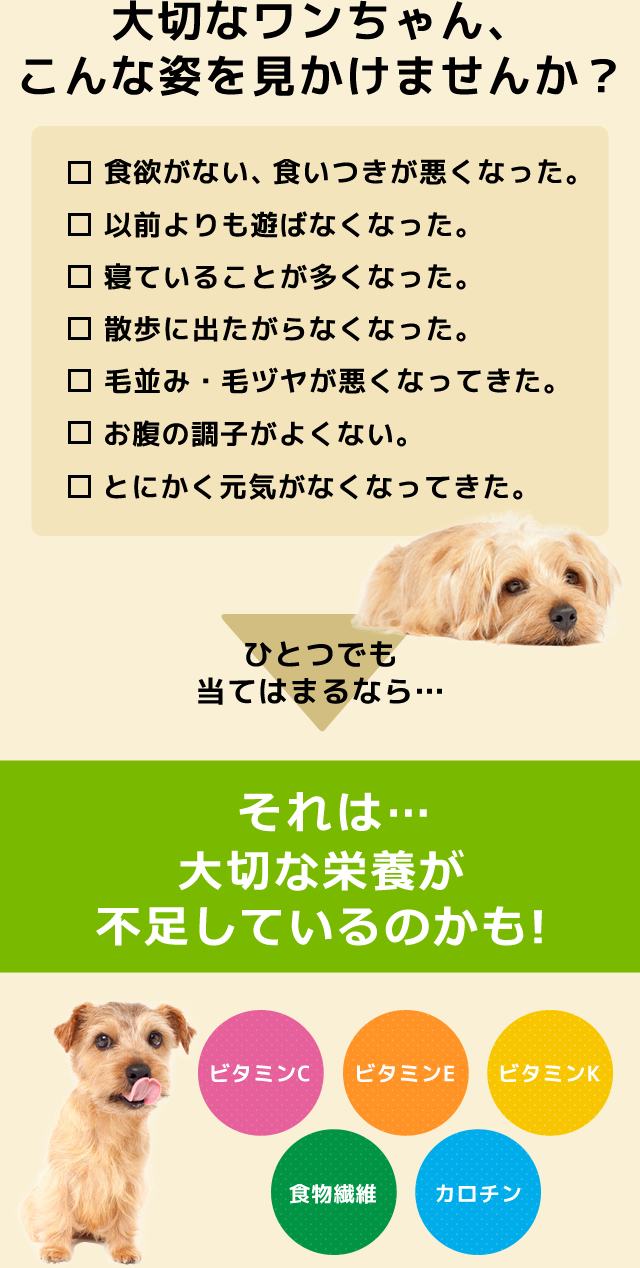 また、人間でも食べ合わせといいますように、同じ栄養素でも摂取の仕方で吸収率が違ってきます。ある栄養素を摂ると、別の栄養素の吸収を高めることができるのは犬も同じです。そういった意味からも、ベジタブルサポートは、ペットフードのマルチな栄養素の吸収をさらに高めることができる「犬専用栄養補助食品」とも言えると思います。