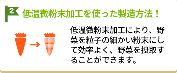 野菜を低温で微粉末加工する独自の技術により、犬の腸でも消化吸収できるようにしています。