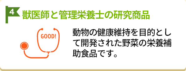 この結果をもとに、私たちは天然素材だけを数種類組合せて、消化・吸収性に優れた画期的な動物専用栄養補助食品として、ベジタブルサポートの製品化に成功しました。