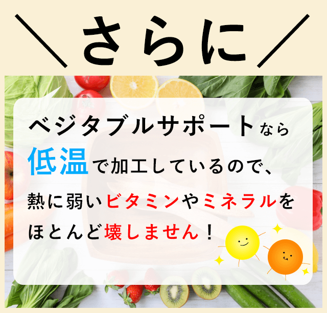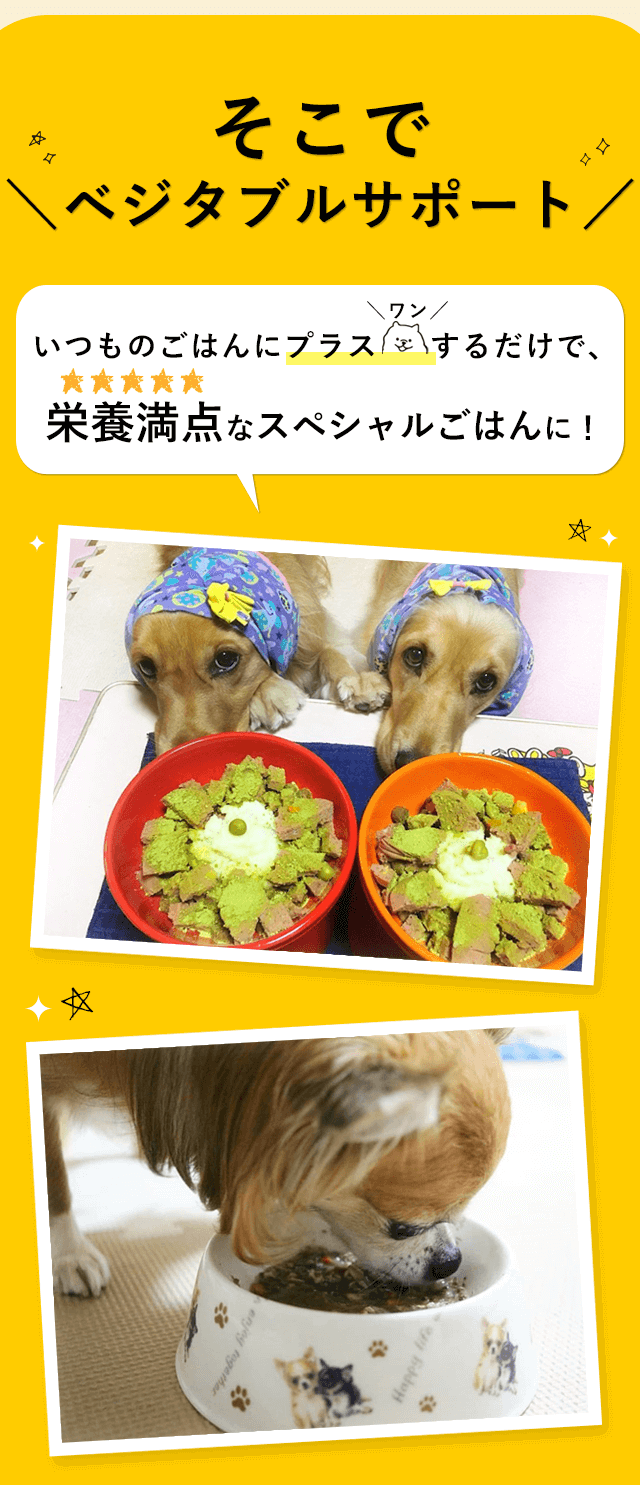- ・ベジタブルサポートは健康維持のためにお使いいただきたい商品ですので、現在動物病院にて治療中の疾患があるワンちゃんに使用する際は、獣医師の先生にご相談下さい。