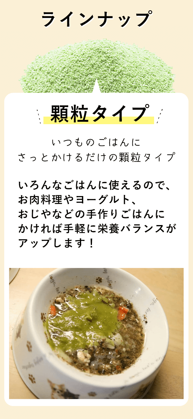 ペットフードは総合栄養食、それ以外のものを与える必要はないと認識されている方が多いようですが、 栄養学はまだまだ発展段階で、解明されていない栄養素は無数に存在すると言われています。
